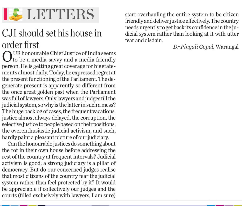 Today, including the Sundays and the vacations, the courts do not work for almost 130- 135 days of an year, a whopping amount of official holidays( almost 30-35% of the year). Is it any wonder why the backlogs runs for many decades in many cases? Why cannot the courts run like all other essential services like electricity, railways, hospitals, all days of the week? There can be provision to deal with the cases after hours and on Sundays by emergency rotations of the judges like they do for doctors. Increasing the number of judges, which our articulate CJI seems to batting for, is a good solution, but only a partial one. We need more working hours.