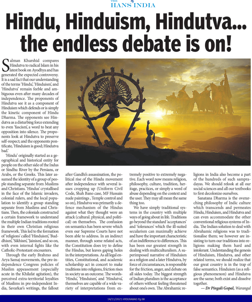 The confusion on semantics has been severe which even our Supreme Courts have not been able to address. In an indirect manner, through some related acts, the Constitution does try to define the Hindus, but leaves gaping holes in the interpretations. As all legal entities, Constitutional, and academic scholarship act in concert to make traditions into religions, friction rises in society as an outcome. The words- ‘Hindu’, ‘Hinduism’, and ‘Hindutva’, themselves are capable of a wide variety of interpretations from extremely positive to extremely negative. Each word now means religion, philosophy, culture, tradition, heritage, practices, or simply a word of abuse depending on the context and the user. They may all mean the same thing too.