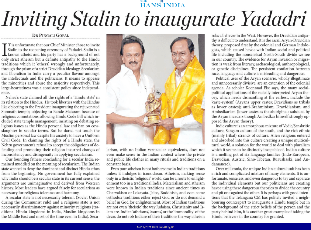 It is unfortunate that our respectable Chief Minister chose to invite Stalin in the reopening ceremony of Yadadri. Stalin is a known atheist and his party has a background of not only strict atheism but a definite antipathy to the Hindu traditions which it ‘others’, wrongly and unfortunately, through the prism of a strict Dravidian ideology. Secularism and liberalism in India carry a peculiar flavour amongst the intellectuals and the politicians. It means to appease the minorities and abuse the majority respectively. This large-heartedness was a consistent policy since independence. Nehru’s state claimed all the rights of a ‘Hindu state’ in its relation to the Hindus. He took liberties with the Hindus like objecting to the President inaugurating the rejuvenated Somnath temple; objecting to Bande Mataram because of religious connotations; allowing Hindu Code Bill which included state temple management; insisting on debating religious issues as the Hindu personal law and ban on cow-slaughter in secular terms. But he dared not touch the Muslim personal law despite his anxiety to have a Uniform Civil Code. In claiming the rights of a Hindu state, Nehru government’s refusal to accept the obligations of defending and promoting their religion incurred charges of inconsistency and disingenuity in applying secularism.