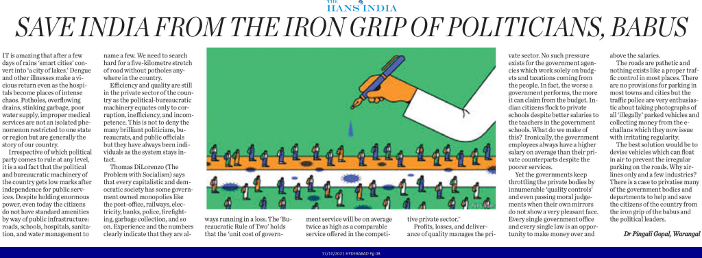 Thomas DiLorenzo (The Problem with Socialism) says that every capitalistic and democratic society has some government owned monopolies like the post-office, railways, electricity, banks, police, firefighting, garbage collection, and so on. Experience and the numbers clearly indicate that they are always running in a loss. The ‘Bureaucratic Rule of Two’ holds that the ‘unit cost of government service will be on average twice as high as a comparable service offered in the competitive private sector.’ Profits, losses, and deliverance of quality manages the private sector. No such pressure exists for the government agencies which work solely on budgets and taxations coming from the people. In fact, the worse a government performs, the more it can claim from the budget. Indian citizens flock to private schools despite better salaries to the teachers in the government schools. What do we make of this? Ironically, the government employees always have a higher salary on average than their private counterparts despite the poorer services.