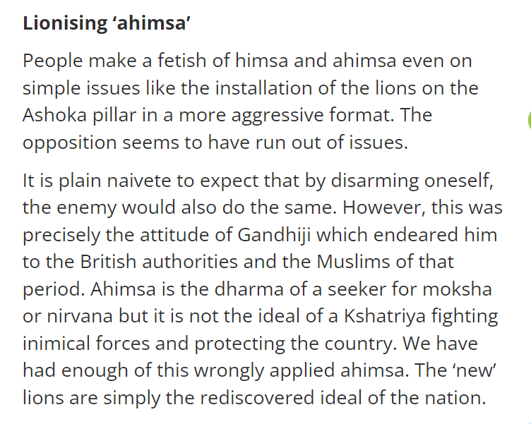 People make a fetish of ‘himsa’ (violence) and ‘ahimsa’ (non-violence) even on simple issues like the installation of the lions on the Ashoka pillar in a more aggressive format. The opposition seems to have run out of issues. A lion commands respect for its ferocity and aggressiveness just as a cow generates love for its sheer serenity. Arguably, serenity and peace on the face of a lion is as contradictory as a look of aggression on a cow. This depiction of lions is hardly a violation of its essential nature. However, it is amazing that when the so-called ‘right-wing’ or ‘traditionals’ want change, the left-liberals actually oppose it! Ahimsa and non-violence are unfortunately a superficial superimposition upon us an ideal of the nation and this is a big mistake.