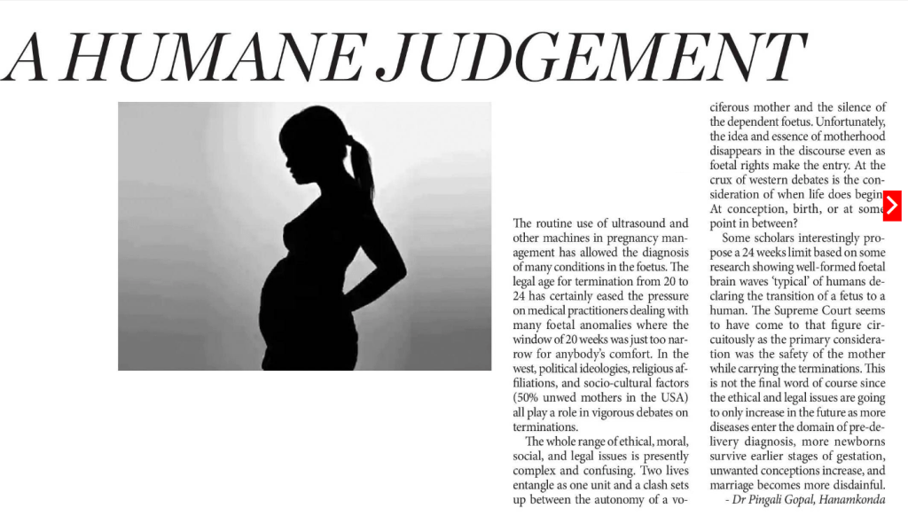 The routine use of ultrasound and other machines in pregnancy management has allowed the diagnosis of many conditions in the foetus. The legal age for termination from 20 to 24 has certainly eased the pressure on medical practitioners dealing with many foetal anomalies where the window of 20 weeks was just too narrow for anybody’s comfort. In the west, political ideologies, religious affiliations, and socio-cultural factors (50% unwed mothers in the USA) all play a role in vigorous debates on terminations. The whole range of ethical, moral, social, and legal issues is presently complex and confusing. Two lives entangle as one unit and a clash sets up between the autonomy of a vociferous mother and the silence of the dependent foetus. Unfortunately, the idea and essence of motherhood disappears in the discourse even as foetal rights makes its entry. At the crux of western debates is the consideration of when does life begin? At conception, birth, or at some point in between? Some scholars interestingly propose a 24 weeks limit based on some research showing well-formed foetal brain waves ‘typical’ of humans declaring the transition of a fetus to a human. The Supreme Court seems to have come to that figure circuitously as the primary consideration was the safety of the mother while carrying the terminations. This is not the final word of course since the ethical and legal issues are going to only increase in the future as more diseases enter the domain of pre-delivery diagnosis, more newborns survive earlier stages of gestation, unwanted conceptions increase, and marriage becomes more disdainful.