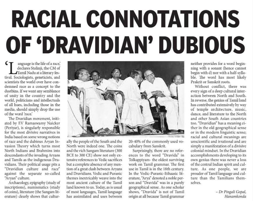 ‘Language is the life of a race,’ declares Stalinji at a literary festival. Sociologists, geneticists, and scientists the world over have condemned race as a concept to the dustbins. If we want any semblance of unity in the country and the world, politicians and intellectuals of all hues including those in the media should simply drop the use of the word race. The Dravidian movement, initiated by EV Ramaswamy Naicker (Periyar), is singularly responsible for the most divisive narratives in India based on some wrong notions of race and the dubious Aryan Invasion Theory which turns most North Indians and Brahmins into descendants of the invading Aryans and Tamils as the indigenous Dravidians. Their political usage pits a “Dravidian culture and race” against the separate so-called “Aryan” culture.