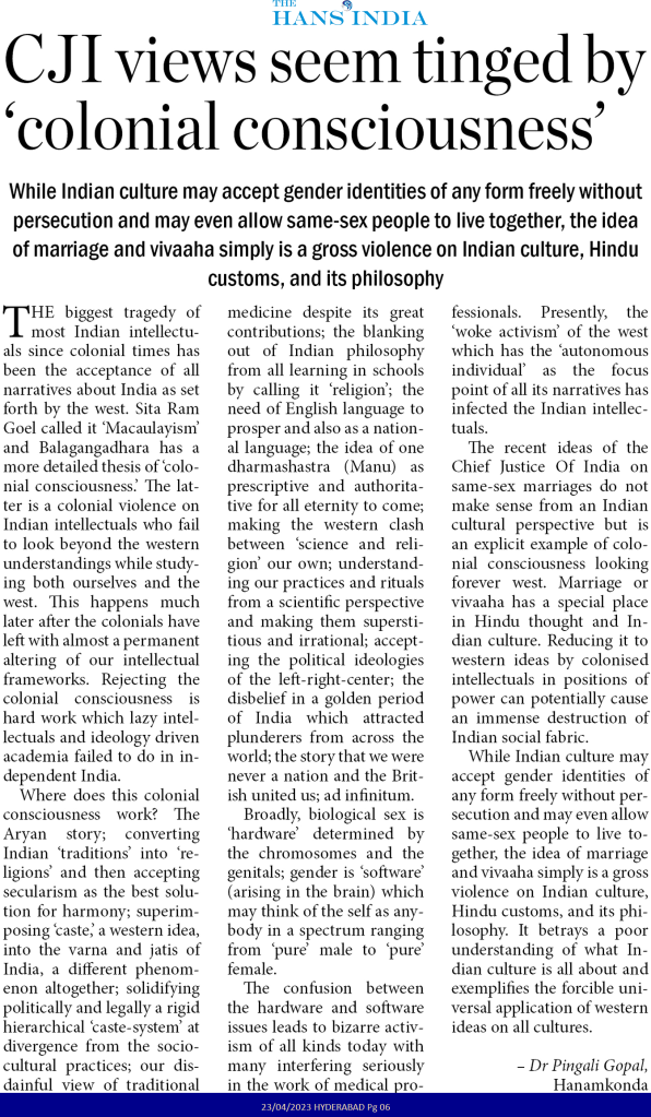 Broadly, biological sex is ‘hardware’ determined by the chromosomes and the genitals; gender is ‘software’ (arising in the brain) which may think of the self as anybody in a spectrum ranging from ‘pure’ male to ‘pure’ female. The confusion between the hardware and software issues leads to bizarre activism of all kinds today with many interfering seriously in the work of medical professionals. Presently, the ‘woke activism’ of the west which has the ‘autonomous individual’ as the focus point of all its narratives has infected the Indian intellectuals. The recent ideas of the Chief Justice Of India on same-sex marriages does not make sense from an Indian cultural perspective but is an explicit example of colonial consciousness looking forever west.