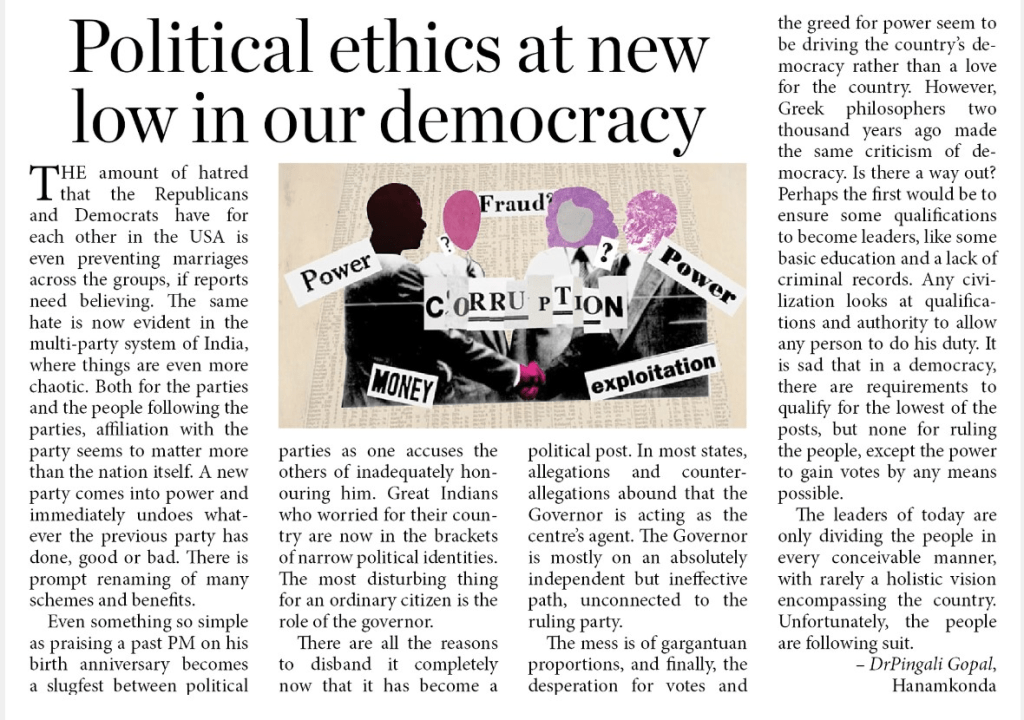 The mess is of gargantuan proportions, and finally, the desperation for votes and the greed for power seem to be driving the country’s democracy rather than a love for the country. However, Greek philosophers two thousand years ago made the same criticism of democracy. Is there a way out? Perhaps the first would be to ensure some qualifications to become leaders, like some basic education and a lack of criminal records. Any civilization looks at qualifications and authority to allow any person to do his duty. It is sad that in a democracy, there are requirements to qualify for the lowest of the posts, but none for ruling the people, except the power to gain votes by any means possible. The leaders of today are only dividing the people in every conceivable manner, with rarely a holistic vision encompassing the country. Unfortunately, the people are following suit.