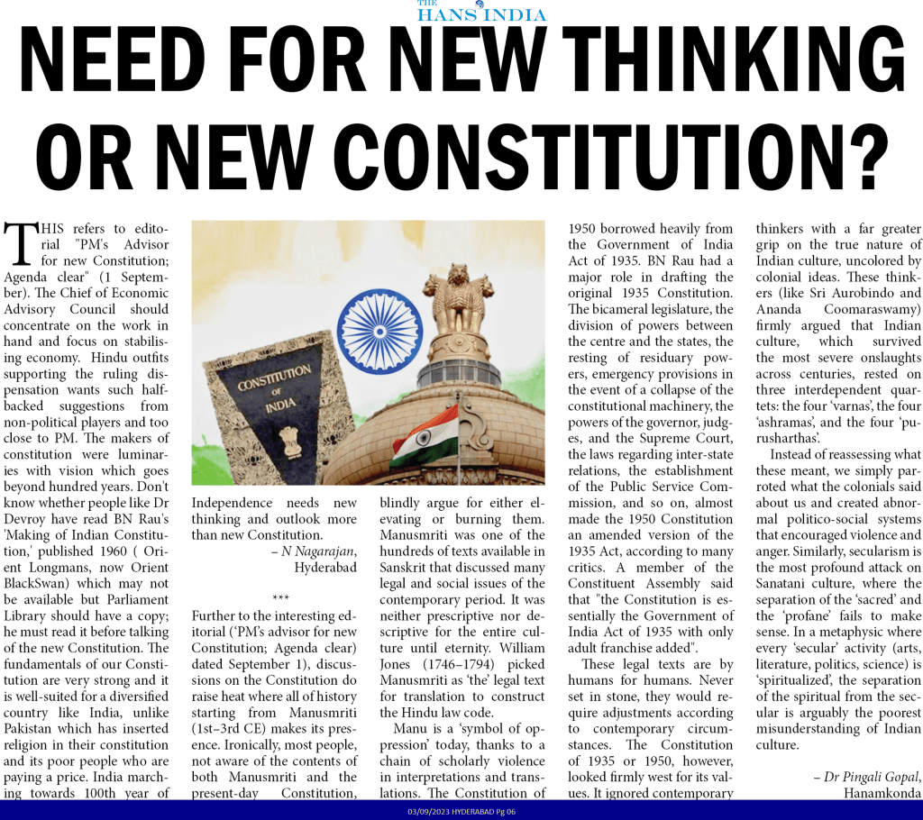 Further to the interesting editorial (PM’s advisor for new Constitution; Agenda clear dated September 1st), discussions on the Constitution do raise heat where all of history starting from Manusmriti (1st–3rd CE) makes its presence. Ironically, most people, not aware of the contents of both Manusmriti and the present-day Constitution, blindly argue for either elevating or burning them. Manusmriti was one of the hundreds of texts available in Sanskrit that discussed many legal and social issues of the contemporary period. It was neither prescriptive nor descriptive for the entire culture until eternity. William Jones (1746–1794) picked Manusmriti as ‘the’ legal text for translation to construct the Hindu law code.
