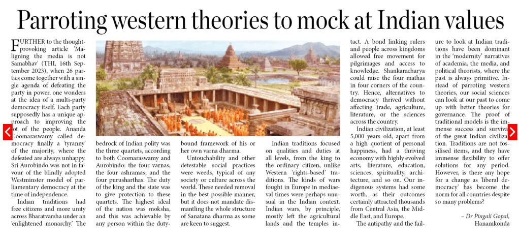 The antipathy and the failure to look at Indian traditions have been dominant in the ‘modernity’ narratives of academia, the media, and political theorists, where the past is always primitive. Instead of parroting western theories, our social sciences can look at our past to come up with better theories for governance. The proof of traditional models is the immense success and survival of the great Indian civilization. Traditions are not fossilised items, and they have immense flexibility to offer solutions for any period. However, is there any hope for a change as ‘liberal democracy’ has become the norm for all countries despite so many problems?