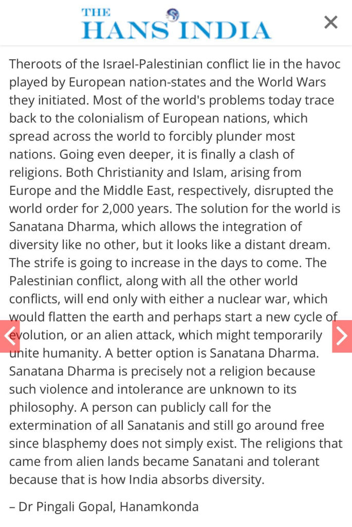 The solution for the world is Sanatana Dharma, which allows the integration of diversity like no other, but it looks like a distant dream. The strife is going to increase in the days to come. The Palestinian conflict, along with all the other world conflicts, will end only with either a nuclear war, which would flatten the earth and perhaps start a new cycle of evolution, or an alien attack, which might temporarily unite humanity. A better option is Sanatana Dharma.