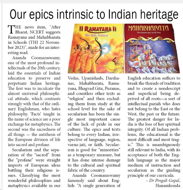 The news item, “After Bharat, NCERT suggests Ramayana and Mahabharata in Schools (The Hans India 22, 2023),” made for an interesting read. Education is the building up of character, and nothing builds the character of a person more than these two epics.