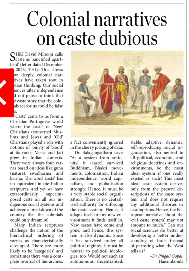 Shri David Miltonji calls caste as ‘sanctified apartheid’ (letter dated December 2, 2023, THI). This shows how deeply colonial narratives have taken root in Indian thinking. Our social sciences after independence did not pause to think that the caste story that the colonials set for us could be false too.