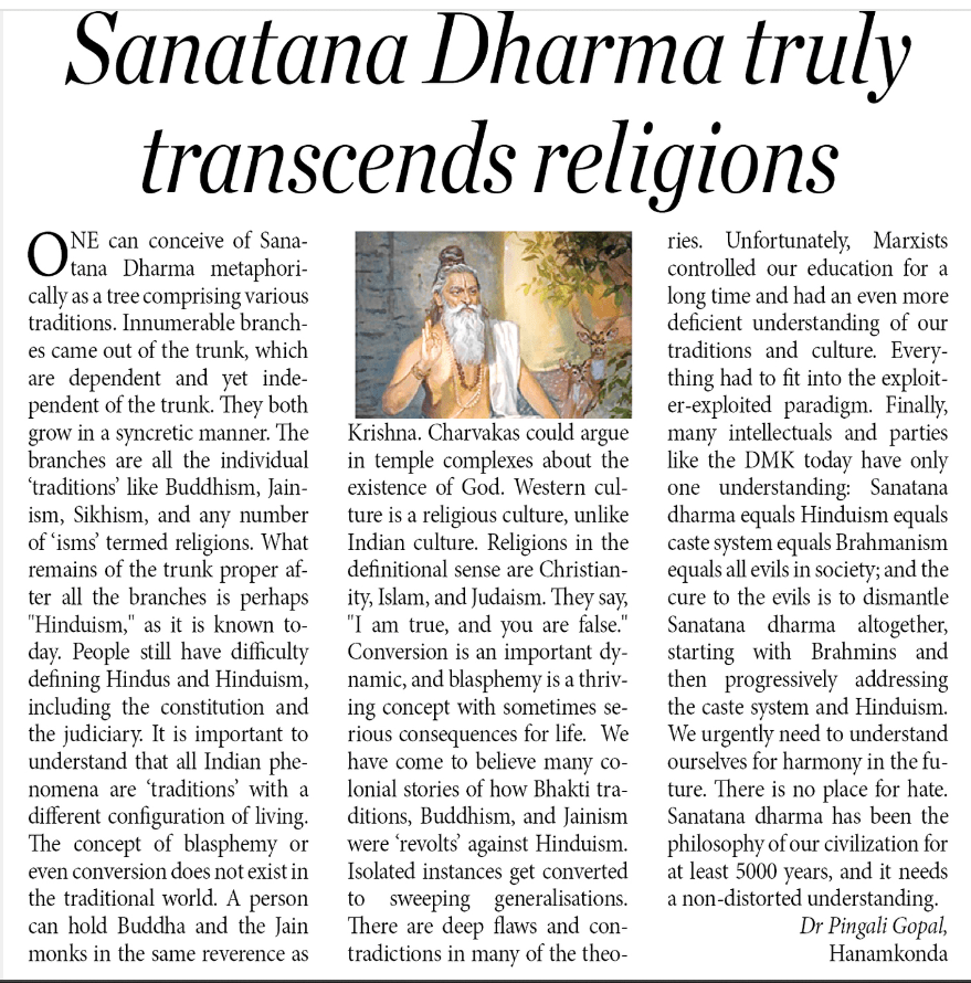 There are many problems with such an understanding of Indian culture and Sanatana dharma, which is the overarching framework of harmony. Equating it to all evils is a sign of intellectual immaturity, bias, hatred, ignorance, and perhaps all. At a larger level, it increases the fissures and inequalities in society, which it perhaps wants to address. Santana dharma is not about division or “toxic, masculine, patriarchy.”