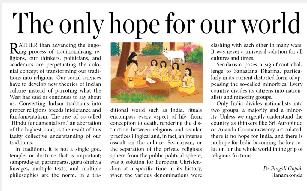 Secularism poses a significant challenge to Sanatana Dharma, particularly in its current distorted form of appeasing the so-called minorities. Every country divides its citizens into nationalists and minority groups. Only India divides nationalists into two groups: a majority and a minority. Unless we urgently understand the country as thinkers like Sri Aurobindo or Ananda Coomaraswamy articulated, there is no hope for India, and there is no hope for India becoming the key solution for the whole world in the grip of religious frictions.