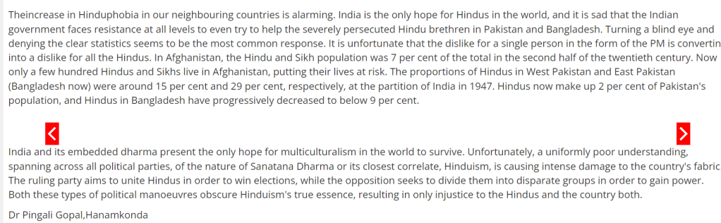 The increase in Hinduphobia in our neighbouring countries is alarming. India is the only hope for Hindus in the world, and it is sad that the Indian government faces resistance at all levels to even try to help the severely persecuted Hindu brethren in Pakistan and Bangladesh. Turning a blind eye and denying the clear statistics seems to be the most common response. It is unfortunate that the dislike for a single person in the form of the PM is converting into a dislike for all the Hindus. In Afghanistan, the Hindu and Sikh population was 7 percent of the total in the second half of the twentieth century. Now only a few hundred Hindus and Sikhs live in Afghanistan, putting their lives at risk. The proportions of Hindus in West Pakistan and East Pakistan (Bangladesh now) were around 15 percent and 29 percent, respectively, at the partition of India in 1947. Hindus now make up 2 percent of Pakistan’s population, and Hindus in Bangladesh have progressively decreased to below 9 percent. India and its embedded Dharma present the only hope for multiculturalism in the world to survive. Unfortunately, a uniformly poor understanding, spanning across all political parties, of the nature of Sanatana Dharma or its closest correlate, Hinduism, is causing intense damage to the country’s fabric. The ruling party aims to unite Hindus in order to win elections, while the opposition seeks to divide them into disparate groups in order to gain power. Both these types of political manoeuvres obscure Hinduism’s true essence, resulting in only injustice to the Hindus and the country both.