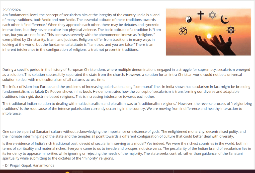 Is there evidence of India’s rich traditional past, devoid of secularism, serving as a model? Yes indeed. We were one of the richest countries in the world, both in terms of spirituality and material riches. Everyone came to us to invade and prosper, not vice versa. The peculiarity of the Indian brand of secularism lies in its tendency to appease minorities while ignoring or rejecting the needs of the majority. The state seeks control, rather than guidance, of the Sanatani spirituality while submitting to the dictates of the “minority” religions.
